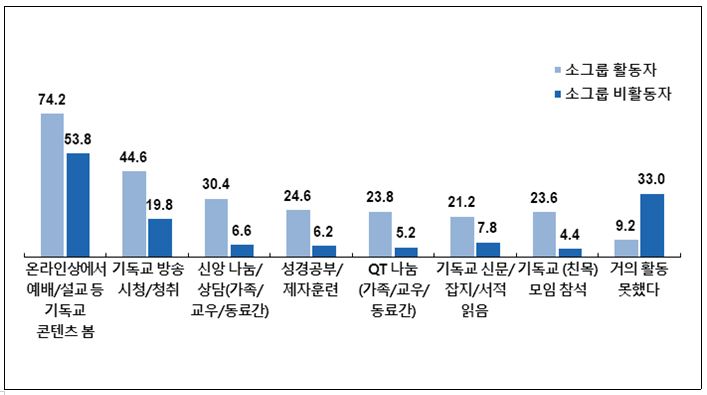 특히 소그룹 활동자는 '기독교 방송 시청/청취'(44.6%)와 '신앙 나눔/상담'(30.4%)을 다음으로 많이 한 것으로 응답한 반면, 소그룹 비활동자 세 명 중 한 명(33.0%)은 지난 1주일 간 신앙 활동을 '거의 하지 못했다'고 응답했다.