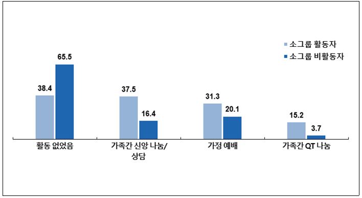 특히 소그룹 활동자의 37.5%는 '신앙 나눔/상담', 31.3%는 '가정 예배', 15.2%는 '가족 간 QT 나눔'을 했다고 응답했으며, 소그룹 활동자가 비활동자보다 예배 행위(가정예배)보다 나눔 행위(신앙나눔/QT나눔)을 더 많이 하는 것을 볼 때, 소그룹 활동자가 비활동자보다 가족 관계가 좀 더 친밀할 것이라는 추정이 가능하다고 분석했다.