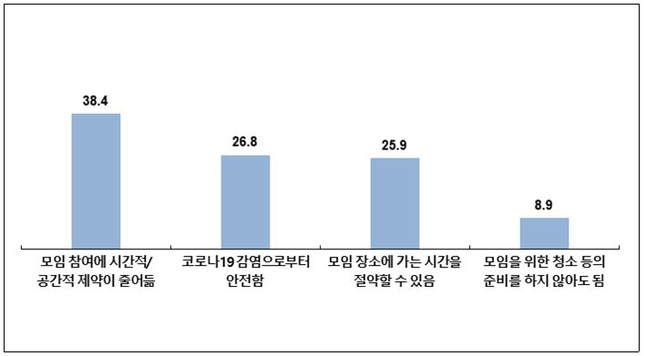 코로나19 상황에서 온라인 소그룹 모임을 평가하기 위해 온라인 소그룹에 참여하고 있는 이들을 대상으로 '온라인 모임이 오프라인 모임에 대해 좋은 점'에 대해 질문한 결과, '모임 참여에 시간적/공간적 제약이 줄어듦'이 38.4%, '코로나19 감염으로부터 안전함' 26.8%, '모임 장소에 가는 시간을 절약할 수 있음' 25.9% 등으로 응답됐다. 즉, 편리성과 안정성이 온라인 모임의 장점으로 인식되고 있는 것으로 나타났다.
