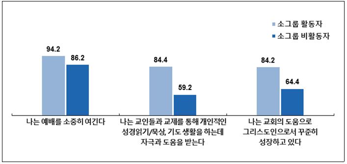 소그룹 활동자와 비활동자(1,000명)를 대상으로 '예배와 개인 신앙성장' 등 교회생활과 관련된 동의율(매우 그렇다+약간 그렇다)을 측정한 결과, 소그룹 활동자는 '예배를 소중히 여긴다' 94.2%를 비롯해, '교인들과 교제를 통해 개인적 신앙생활에 자극과 도움을 받는다'와 '교회의 도움으로 그리스도인으로서 꾸준히 성장하고 있다' 등 모두 84% 이상의 동의율을 보였다.