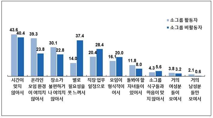 현재 소그룹 모임에 가끔만 참석하거나 거의 참석하지 못하고 사람을 대상으로 그 이유를 물은 결과, 1+2순위 응답률 기준으로, 소그룹 활동자는 '시간이 맞지 않음'을 가장 많이 응답했고(43.6%), 그다음으로 '온라인 모임 환경이 여의치 않아서', '장소가 불편하거나 여의치 않아서'라고 응답했다.