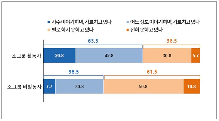 '자녀에게 신앙 교육을 얼마나 하고 있는가'에 대해 질문한 결과 소그룹 활동자의 2/3(63.5%)는 '하고 있다'(자주+어느 정도)고 응답했으며, 소그룹 비활동자는 2/3 가까이(61.5%)가 '하지 못하고 있다'고 응답해 상반된 결과를 나타냈다.