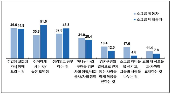 반면, 비활동자는 '예배를 소중히 여긴다'에 대해서는 86.2%가 동의했지만, '교인들과 교제를 통해 개인적 신앙생활에 자극과 도움을 받는다'와 '교회의 도움으로 그리스도인으로서 꾸준히 성장하고 있다'의 동의율은 각각 59.2%, 64.4%로 활동자의 동의율과 큰 차이를 보이는 등 교회 내 소그룹 활동의 중요성이 부각됐다.