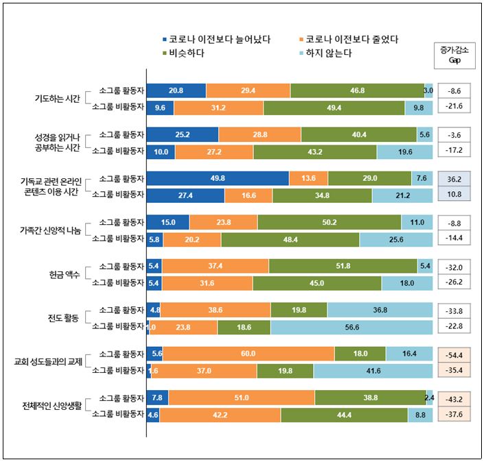 특히 증가(코로나19 이전보다 늘었다)와 감소(코로나19 이전보다 줄었다)의 차이를 보면, '기독교 관련 온라인 콘텐츠 이용 시간'이 유일하게 플러스(+)로 나타났으며, 소그룹 활동자와 비활동자 모두 '교회 성도들과의 교제'와 '전체적인 신앙생활'은 큭 폭 감소한 것으로 조사됐다.