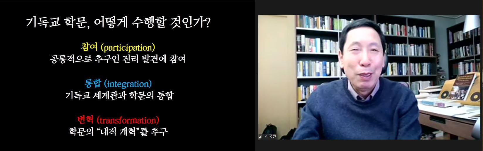 이날 신앙과 학문의 관계를 대립이나 종합보다는 통합으로 인식하는 것이 중요하며 신앙과 학문의 통합을 강조한 신 박사는 "기독교 신앙은 본질적으로나 방법론에 있어서 그리고 가치의 가정을 학문과 공유한다. 기독교 신앙이나 학문 모두 진리를 추구하되 맹목적 믿음이 아니라 이성적 숙고와 경험적 검증 그리고 합리적 논의를 거쳐 아는 것을 확립한다. 또한 기독교 신앙 체계 속에서 학문이 바른 위치를 잡을 때 신앙에도 균형과 조화가 가능하게 된다"라고 강조했다.
