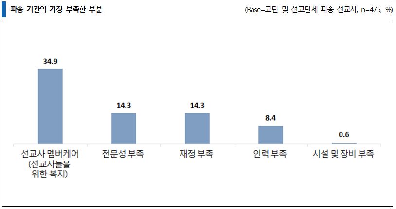 파송 기관의 평가를 묻는 질문에서 해외 선교사들은 '선교사 멤버케어(선교사들을 위한 복지'(34.9%)가 가장 부족한 부분이라고 응답했다. 이어 '전문성 부족'(14.3%), '재정 부족'(14.3%), '인력 부족'(8.4%) 등으로 조사됐다.