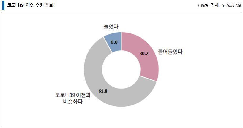반면, 해외 선교사에 대한 재정 후원은 코로나19 이후 전체적으로 줄어든 상태로 나타났다(‘줄어들었다’ 30.2% > ‘늘었다’ 8.0%). 또한 선교사 다섯 명 중 한 명은 경제적 활동을 하는 자비량 선교사인 것으로 조사됐다. 자비량 선교사가 자비량을 통해 얻는 소득은 전체 소득의 50%를 넘었다(평균 55.5%).