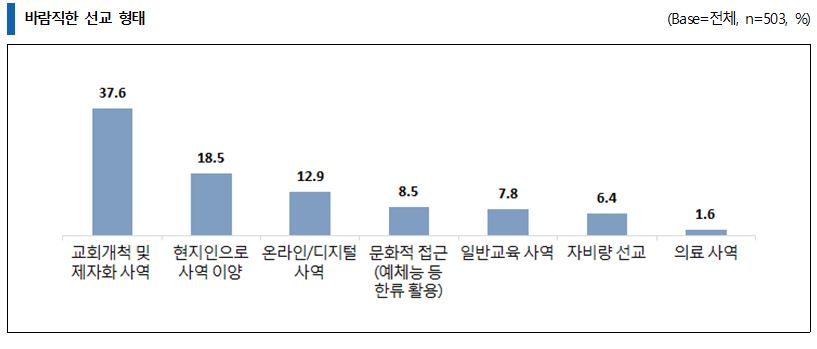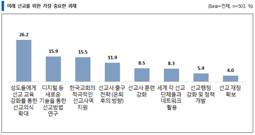 미래 선교를 위한 가장 중요한 과제에 대해 물은 결과, 해외 선교사들은 '성도들에게 선교 교육 강화를 통한 선교의식 확대'(26.2%)를 꼽았으며, 미래 선교 사역 중 '온라인을 기반으로 하는 네트워크 사역'(39.4%)의 비중이 커질 것이라고 예상하고 있었다.