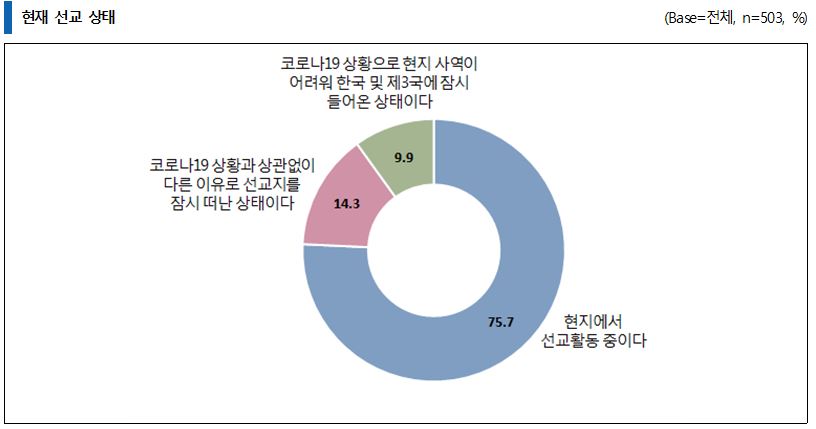 코로나19 팬데믹 상황에서도 해외 선교사의 75.7%는 현지에서 선교활동을 하고 있는 것으로 조사됐으며, 91%는 코로나19가 지속돼도 현지 사역을 계속하겠다는 의지를 갖고 있는 것으로 나타났다.