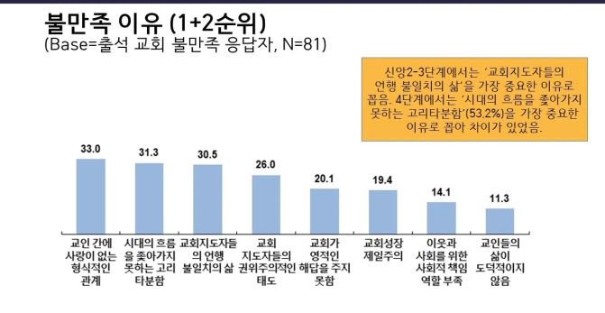 특히 불만족 이유를 물은 결과(출석교회 불만족 응답자 81명), '교인 간에 사랑이 없는 형식적인 관계'(33.0%), '시대의 흐름을 좇아가지 못하는 고리타분함'(31.3%), '교회 지도자들의 언행불일치의 삶'(30.5%) 등 신앙생활에서 진정성 있는 인간관계가 매우 중요한 것으로 조사됐다.
