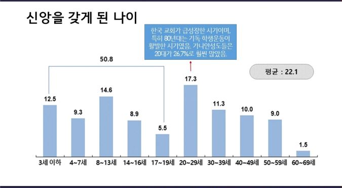 신앙을 갖게 된 시기를 물은 결과, 평균 22.1세에 신앙생활을 시작한 것으로 나타났다. 신앙생활을 하는 이유에 대해서는 절반 가까운 '49.9%가 '구원/영생을 위해'라는 기독교의 본질적 가치 때문이라고 응답했다.