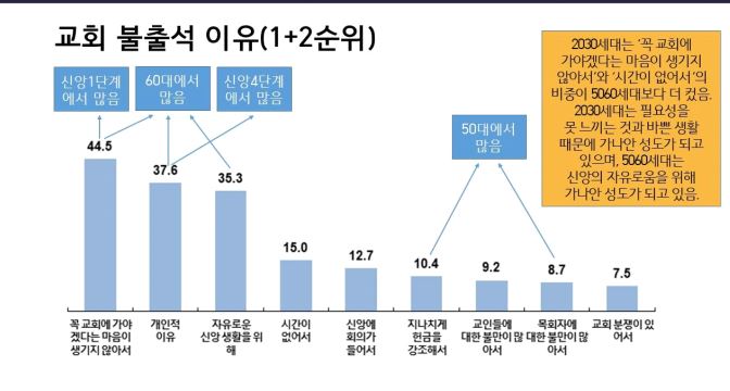 "5060 세대들의 출석교회 만족도는 79.5%로 나타났다. 특히 만족과 불만족으로 나뉘는 큰 이유는 성도들과의 관계, 시대의 흐름을 좇아가지 못하는 교회 모습, 교회 지도자들의 언행불일치의 삶 등이었다"
