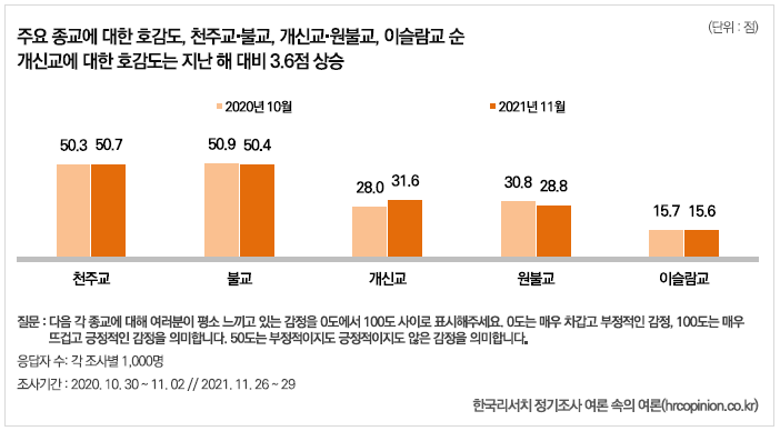 또한 천주교, 불교, 개신교, 원불교, 이슬람교 등 5개 종교 가운데 천주교 불교에 대한 호감도(천주교 50.7점, 불교 50.4점) 가 타종교에 비해 상대적으로 높은 반면 개신교 호감도는 '31.6점'(2020년 호감도 28.0점보다 소폭 상승)에 불과한 것으로 나타났다.