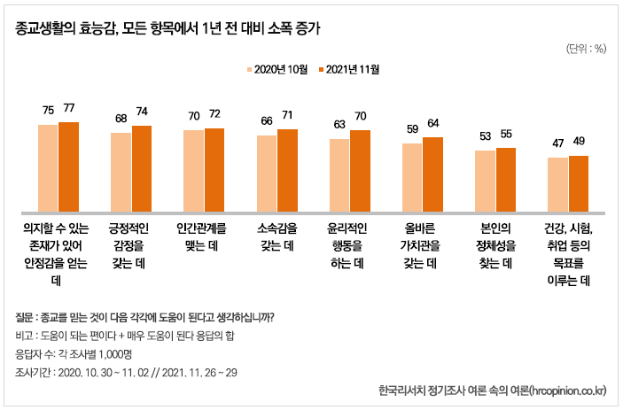 또한 '종교를 믿음으로서 얻을 수 있는 다양한 긍정적 효과'에 대해 물어본 결과, 종교생활이 의지할 수 있는 존재가 있어 안정감을 얻는 데 도움이 된다(77%), 긍정적인 감정을 갖는데(74%), 인간관계를 맺는데(72%), 소속감을 갖는데(71%), 윤리적인 행동을 하는데(70%) 등 종교를 갖고 있으면 안정감, 긍정적 감정, 윤리적 행동 등 효능감이 크게 작용하는 것으로 나타났다.