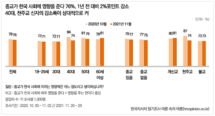 종교의 영향력과 관련된 질문에서 전체 응답자의 76%가 종교가 한국 사회에 영향을 준다고 답한 것으로 나타났다. 네 명 중 세 명 이상이 종교가 한국사회에 영향을 준다고 생각하고 있다는 것.