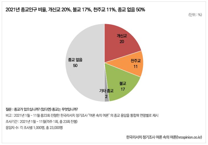 한국리서처 정기조사 '여론 속의 여론'은 2021년 한 해 동안 진행했던 23번의 종교인구 현황 및 종교활동과 관련된 조사 결과를 종합한 결과 "전체 인구의 20%가 개신교를 믿고 있으며, 불교를 믿는 사람은 전체의 17%, 천주교를 믿는 사람은 전체의 11%, 기타 종교를 믿는 사람은 2%로 나타났다.