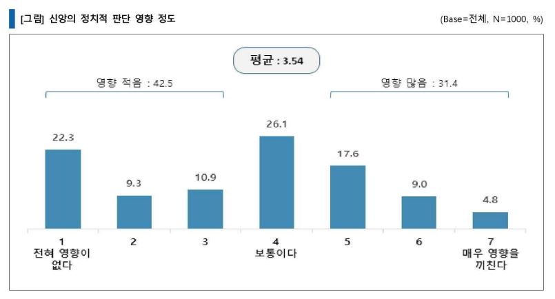 특히 정치적 견해 형성에 신앙이 영향을 미치는 정도에 대해 알아본 결과, '영향 적음'이 42.5%로 ‘영향 많음’ 31.4% 보다 높게 나타났다.