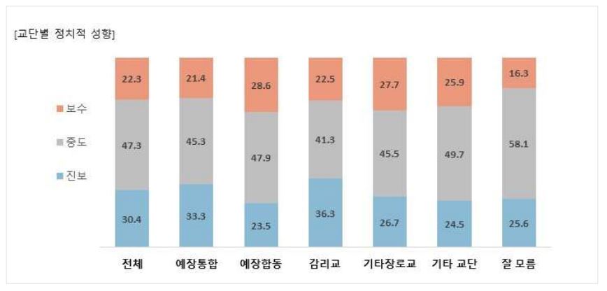 교단별 정치적 성향을 분석한 결과, 주류 교단인 예장통합의 진보와 보수 비율은 각각 33.3%와 21.4%로 나타났고, 감리교의 진보/보수 비율도 36.3%와 22.5%로 예장통합과 비슷하게 나타났다.