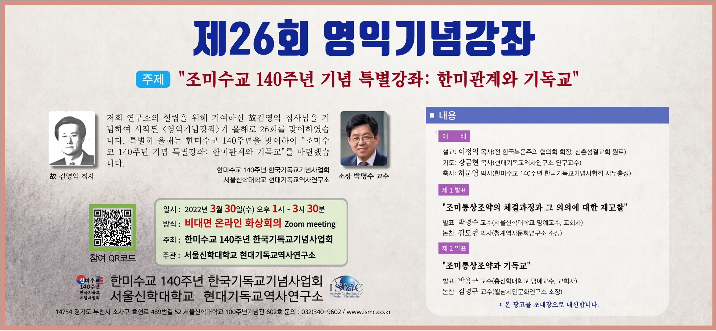 한미수교 140주년 한국기독교기념사업회가 주최하고, 서울신대 현대기독교역사연구소(소장:박명수 박사)가 주관하는 '제26회 영익기념강좌'가 오는 3월 30일(수) 오후 1시 온라인(ZOOM)으로 진행된다.