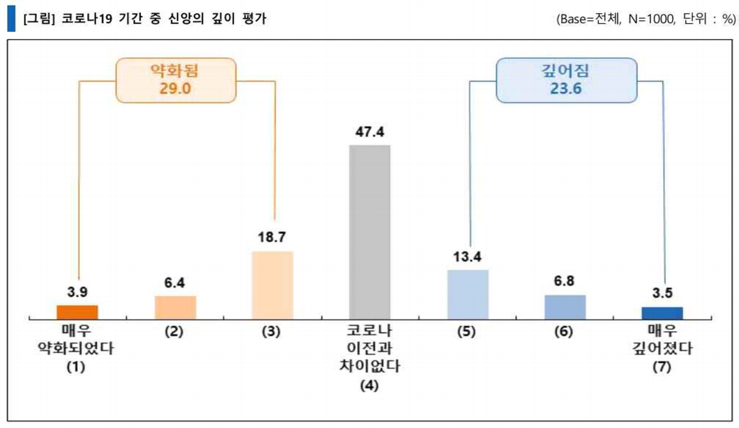 코로나19 이후의 신앙의 깊이에 대해 질문한 결과, 이전과 '차이가 없다'는 답변이 47.7%, '약화' 29%, '심화' 23.6%로 나타났다. 특히 신앙이 깊어졌다는 답변이 20대 그룹에서 30.7%로, 다른 세대 군의 20.4%에서 25.0% 사이의 답변 보다 높게 나타났다.
