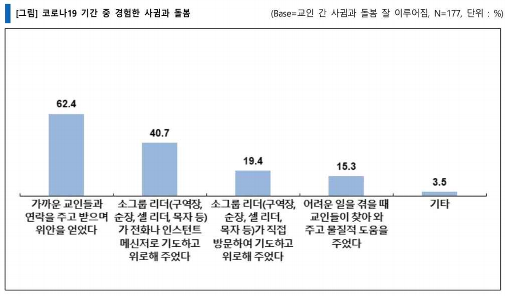 팬데믹 기간 동안 성도들의 사귐과 돌봄의 형태는 '가까운 교인 들과 연락을 주고받으며 위안을 얻는 것'(62.4%)으로 나타났기 때문이다. 또한 '소그룹 리더의 비대면/대면 기도와 위로는 각각 40.7%와 19.4%로 조사됐다.