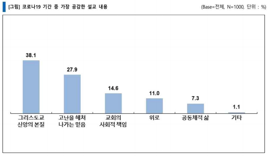 펜데믹 기간 동안 개신교인이 목회자의 설교에서 가장 많이 공감한 내용은 '그리스도교 신앙의 본질'(38.1%)이 가장 높게 나타났다. 정 박사는 "팬데믹의 충격 속에서 평신도가 신앙이란 무엇인가, 예배란 무엇인가, 교회란 무엇인가 등 종교의 근본 의미와 목적을 묻고 있음을 보여준다"라고 설명했다.