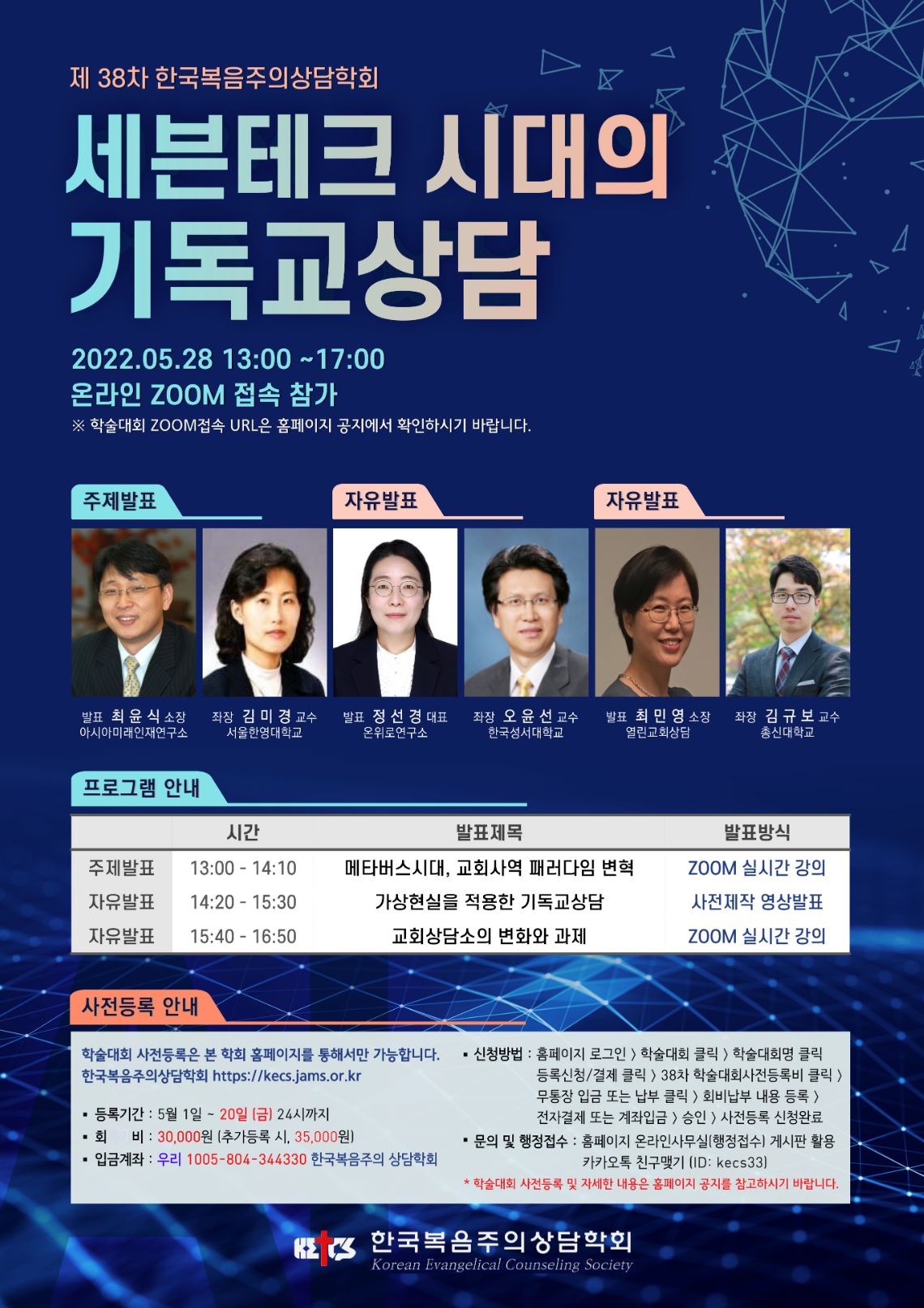 한국복음주의상담학회(회장:김미경 박사/서울한영대 교수)가 오는 5월 28일 오후 1시 온라인(ZOOM)으로 제38차 학술대회를 진행한다.