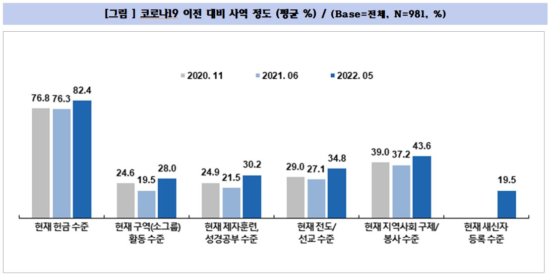 코로나 이전 사역 상태를 100으로 가정했을 때, 각 사역별 현재 상태를 물은 결과, ‘헌금 수준’이 82.4로 가장 높았고, ‘지역사회 구제/봉사 수준’ 43.6, ‘전도/선교 수준’ 34.8, ‘제자훈련, 성경공부 수준’ 30.2, ‘소그룹 활동 수준’ 28.0으로 나타났다.
