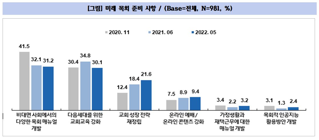 코로나 사태를 겪으며 느낀 미래목회 준비 방향에 대해 물은 결과, ‘비대면 사회에서의 다양한 목회 매뉴얼 개발’과 ‘다음세대를 위한 교회교육 강화’가 각각 31.2%, 30.1%로 가장 높게 나타났다. 다음으로 ‘교회 성장 전략 재정립’이 21.6%로 나타났는데, ‘교회 성장 전략 재정립’에 대한 필요성은 매 해 증가하고 있는 추이를 보이고 있다.