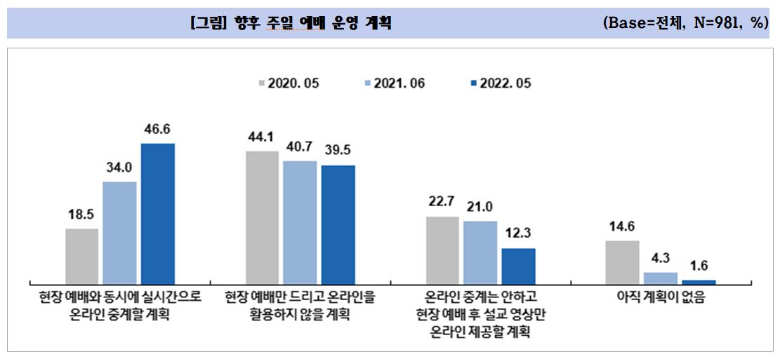 코로나로 인한 거리두기가 완전히 해제된 시점에서 향후 주일 예배 운영 계획을 물은 결과, ‘현장 예배와 동시에 온라인 중계’가 절반 가까이 응답한 것으로 나타났다(46.6%), 반면, ‘현장 예배만 드리고 온라인 활용하지 않음’이 39.5%로 조사됐다.