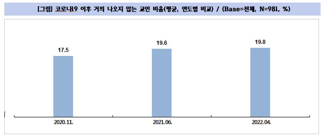 코로나 이전 매주 출석하던 교인 중 코로나 이후 거의 나오지 않은 교인이 전체 중 얼마나 되는지 조사한 결과, 평균 19.8%의 교인이 나오지 않고 있는 것으로 조사됐다. 처음 조사한 2020년 11월, 2021년 6월의 결과와 거의 동일하게 나타났으며, 결국 약 20% 가량의 교인은 코로나를 기점으로 교회에 거의 나가지 않고 있다는 것으로 분석할 수 있다.