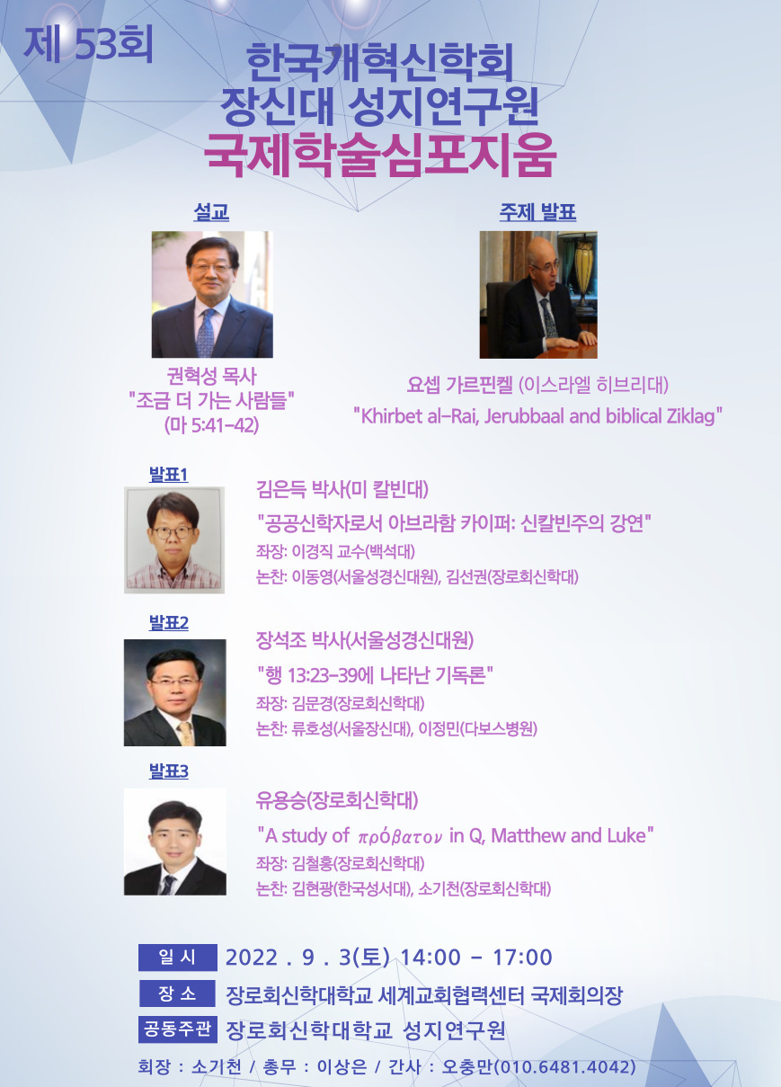 한국개혁신학회(회장:소기천 박사, 장신대 교수)가 장신대 성지연구원과 공동으로 오는 9월 3일 오후 2시 장신대 세계교회협력센터 국제회의장에서 '제53회 국제학술심포지엄'을 개최한다.