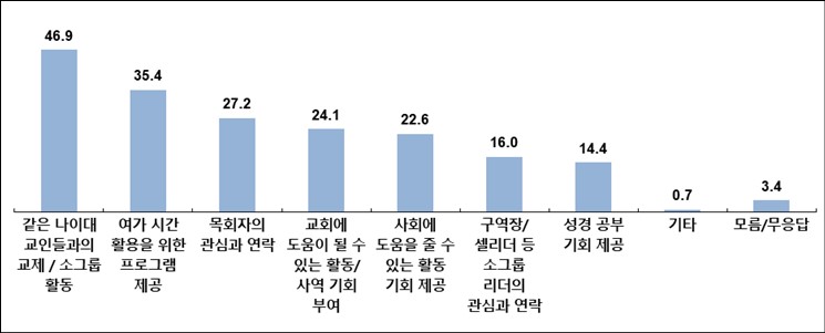고령 교인들이 교회에 바라는 점은 ‘같은 나이대 교인들과의 교제/소그룹 활동’이 46.9%로 가장 많았다. 그 다음으로는 ‘여가시간 활용을 위한 프로그램 제공’(35.4%), ‘목회자의 관심과 연락’(27.2%), ‘교회 도움이 될 수 있는 활동/사역 기회 부여’(24.1%), ‘사회에 도움을 줄 수 있는 활동 기회 제공’(22.6%)으로 나타났다.