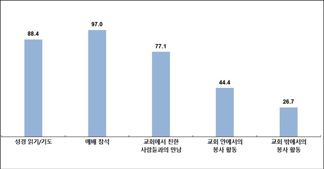 설문조사 결과 고령 교인의 신앙생활 중 ‘예배’ 참석은 거의 모두(97.0%)가 하고 있으며 ‘성경읽기/기도’(88.4%), ‘교인들과의 교제’(77.1%) 등 신앙생활에 매우 적극적인 것으로 나타났다.