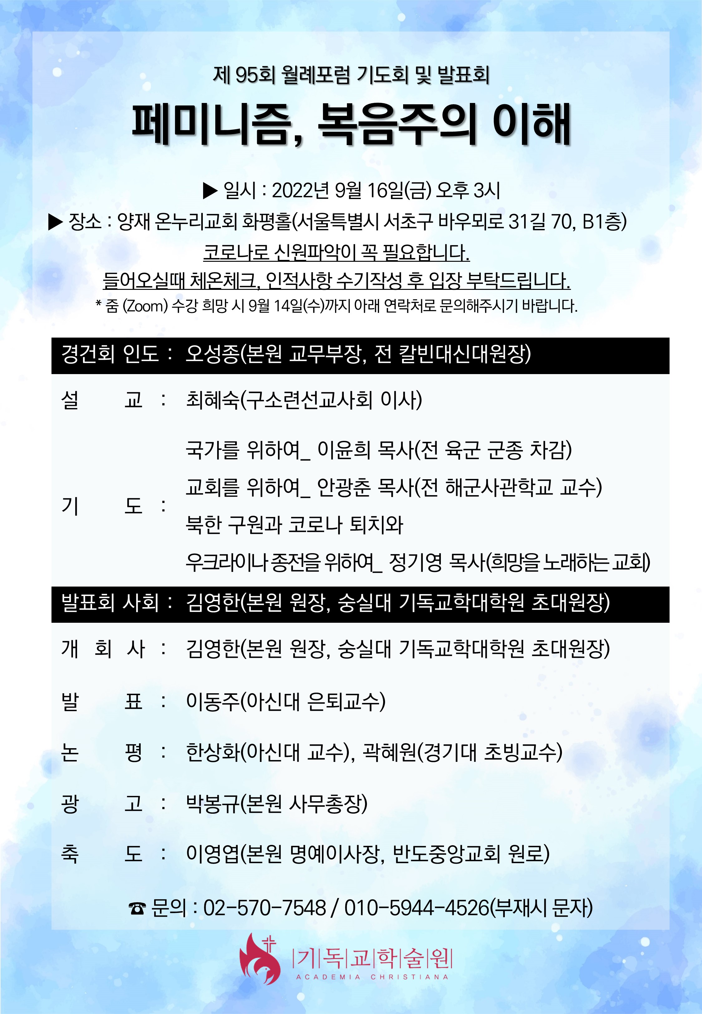 기독교학술원(원장:김영한 박사)이 오는 9월 16일(금) 오후 3시 양재 온누리교회 화평홀에서 '제95회 월례기도회 및 발표회'를 갖는다.