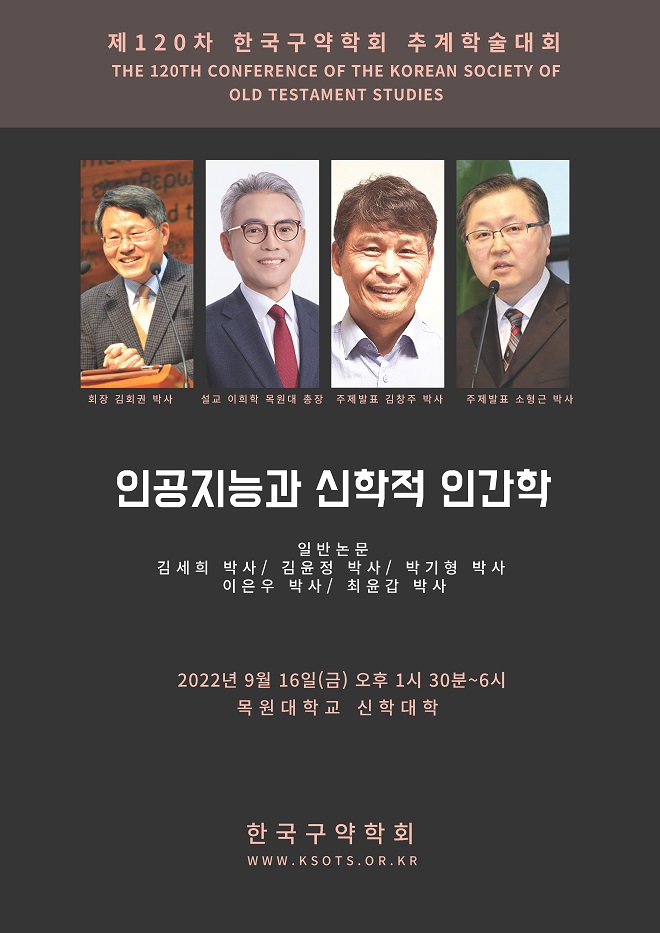 한국구약학회(회장:김회권 박사, 숭실대 교수)가 오는 9월 16일(금) 오후 1시 30분 목원대학교에서 '인공지능과 신학적 인간학'을 주제로 추계학술대회를 진행한다.