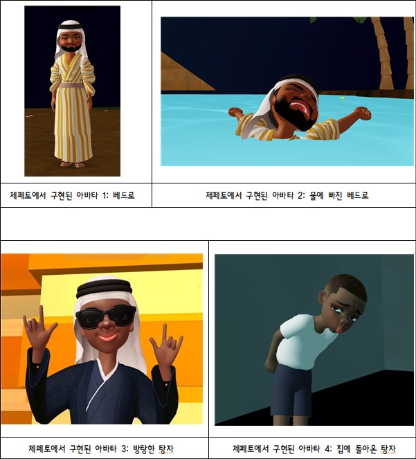 이어 메타버스 플랫폼인 '제페토'(Zepeto)를 활용해서 아마타 모델로 적용시킨 성경이야기 속 주인공인 베드로와 탕자에 대해 설명하면서 "현재 이미 활용되고 있는 상업적 앱을 이용한 성경 이야기의 접근성은 메타버스의 부재를 경험하는 다수 교회공동체의 교회교육 방안에 효과적인 도움을 줄 수 있을 것이다"라고 강조했다.