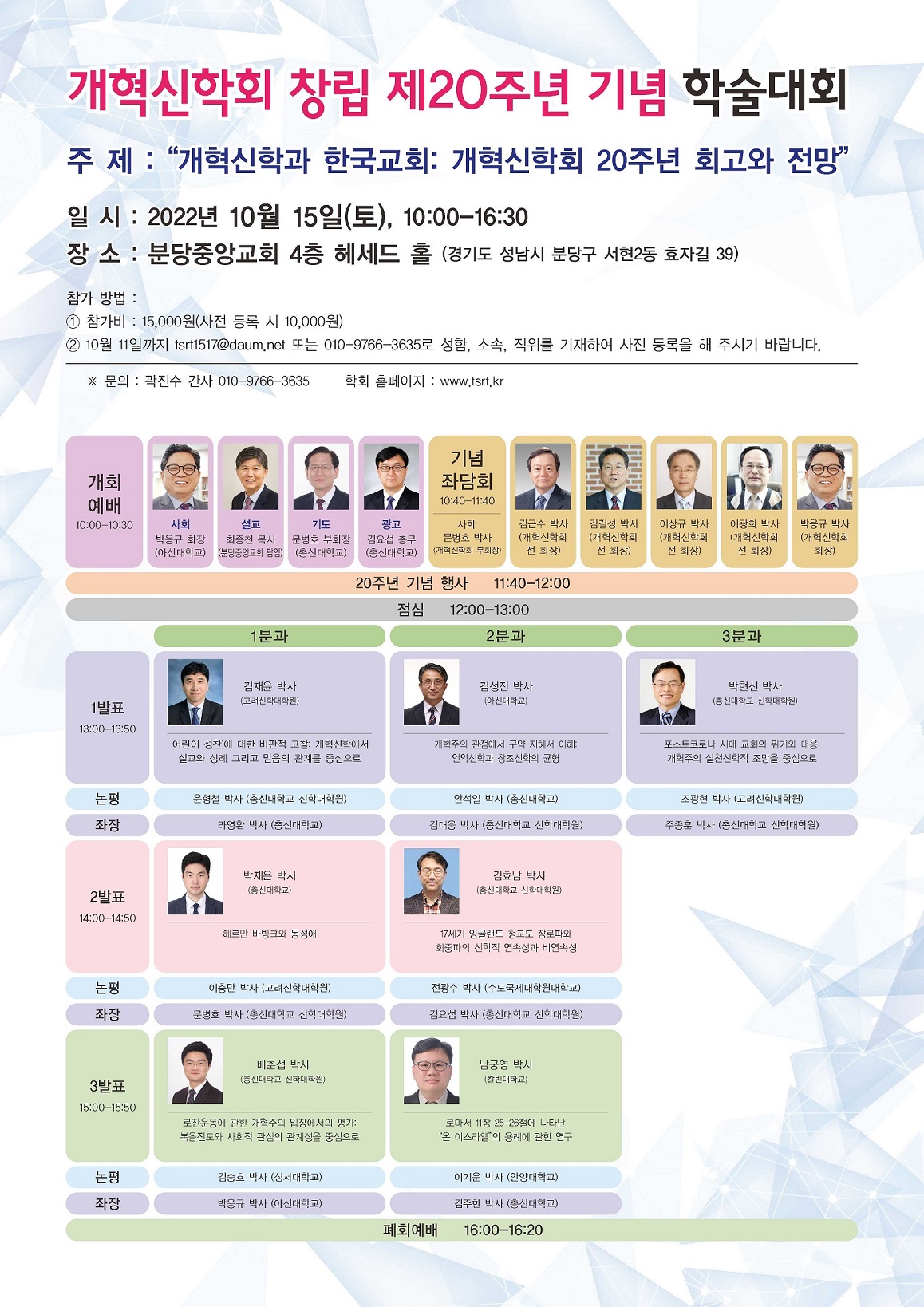 개혁신학회(회장:박응규 박사, 아신대 교수)가 오는 10월 15일(토) 오전 10시 분당중앙교회(담임:최종천 목사) 4층 헤세드홀에서 창립20주년 기념학술대회를 개최한다.