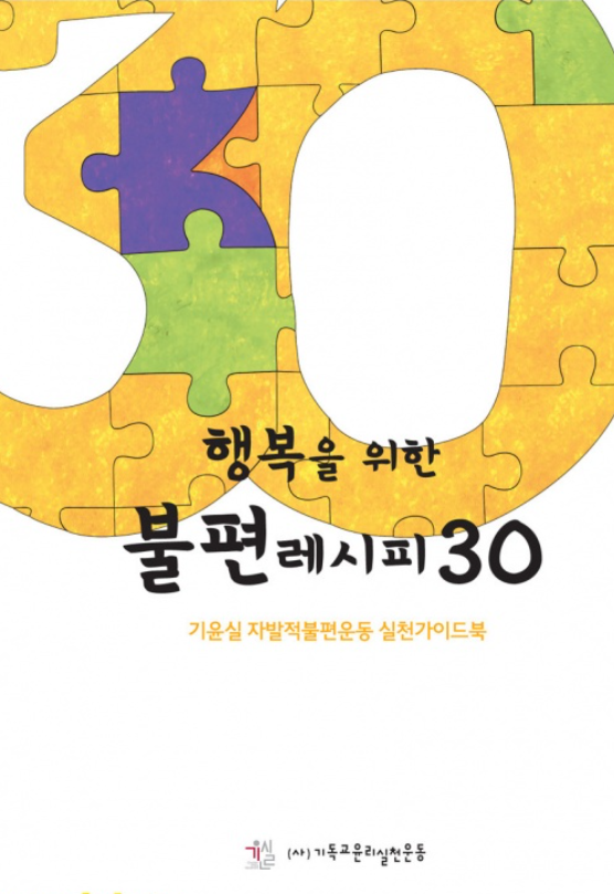 한편, ‘행복을 위한 불편레시피 30’에 담겨 있는 내용은 다음과 같다. 보다 자세한 내용은 기윤실 홈페이지나 기윤실 블로그(http://trusti.tistory.com/955)에서 확인할 수 있다.