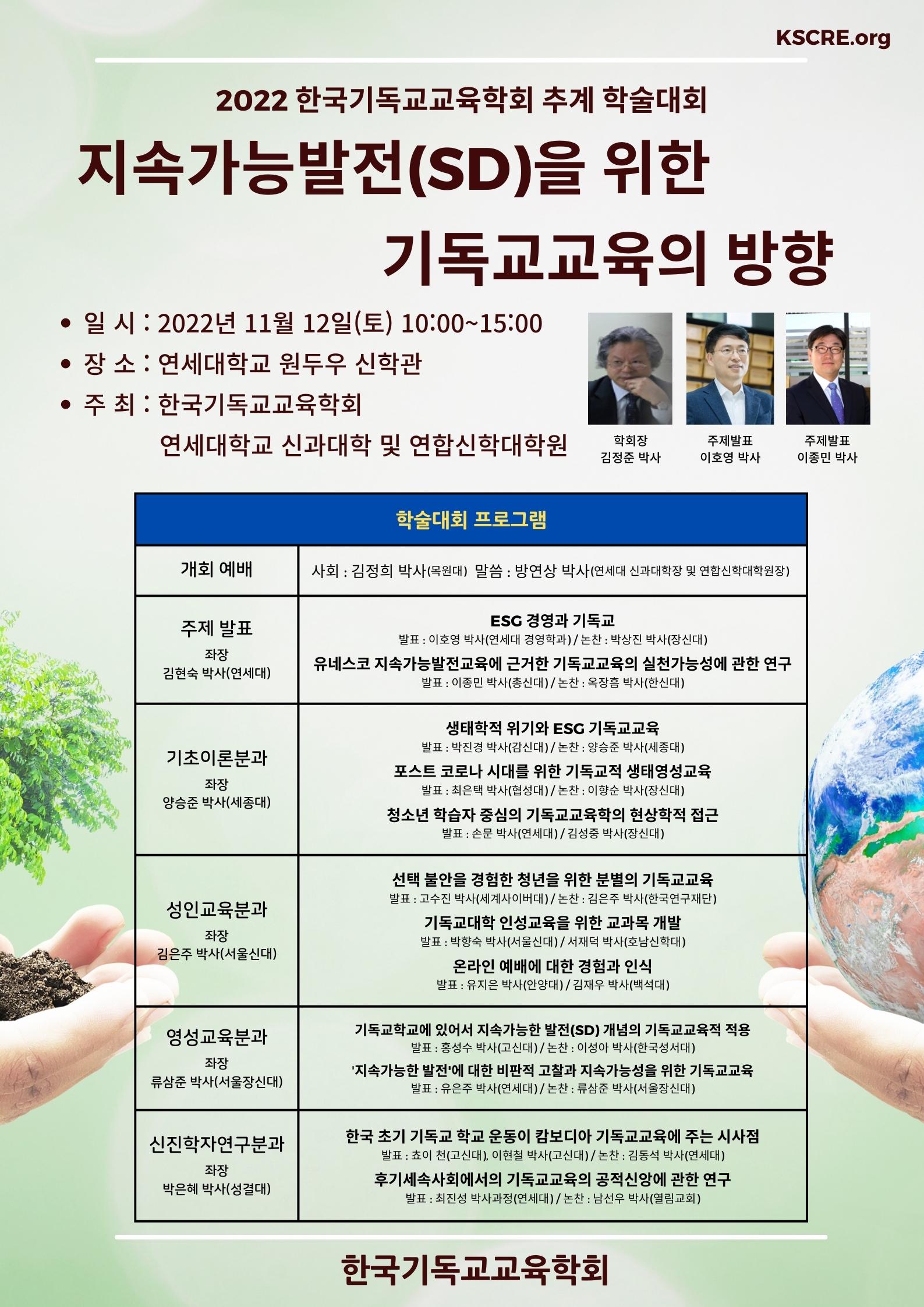 한국기독교교육학회(회장:김정준 박사,성공회대 교수)가 오는 11월 12일 오전 10시 연세대 원두우 신학관에서 '지속가능발전(SD)을 위한 기독교교육의 방향'이라는 주제로 추계 학술대회를 개최한다.