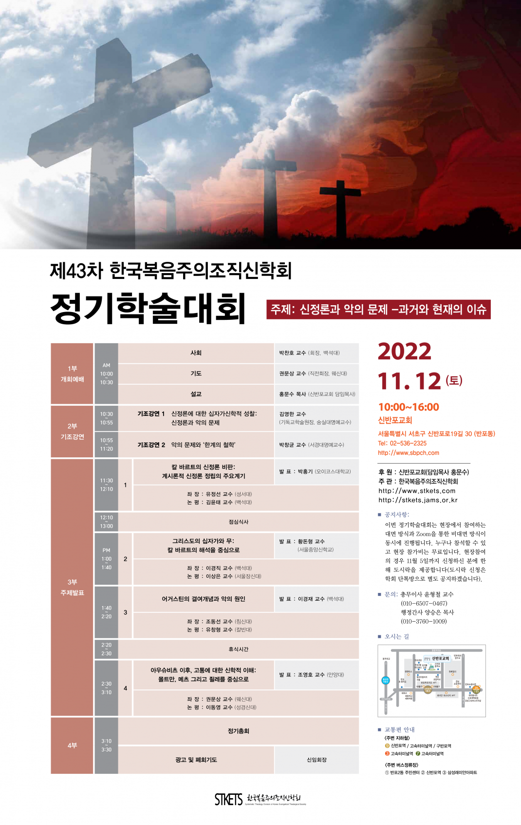 한국복음주의조직신학회(회장:박찬호 박사, 백석대 교수)가 오는 11월 12일(토) 오전 10시 신반포교회(담임:홍문수 목사)에서 '제43차 정기학술대회'를 개최한다.