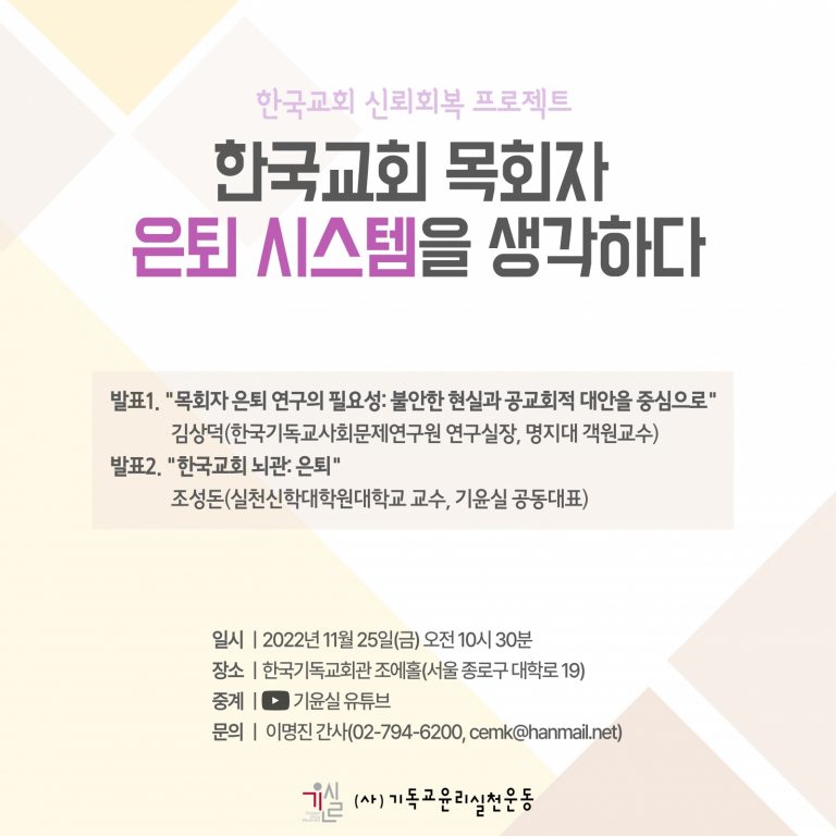 (사)기독교윤리실천운동(기윤실)이 한국교회 신뢰회복 프로젝트의 일환으로 '목회자 은퇴 시스템'과 관련된 연구결과를 발표한다.