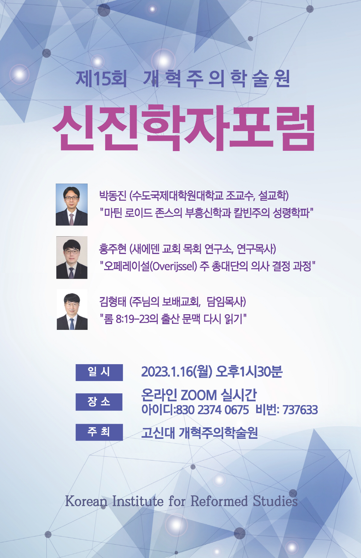 고신대 개혁주의학술원(원장:이신열 박사)가 오는 1월 16일(월) 오후 1시30분 온라인(줌)으로 제15회 신진학자포럼을 개최한다.