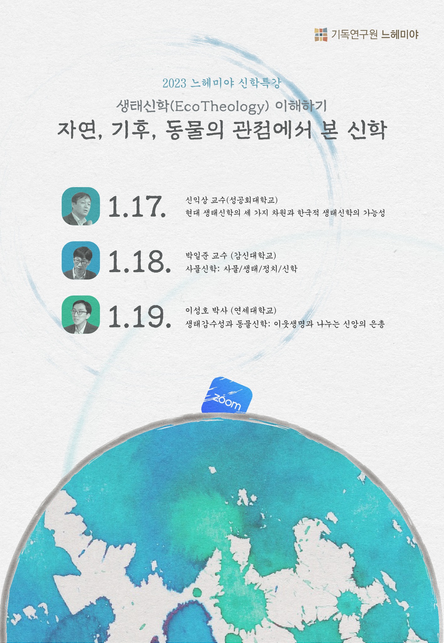 주제는 <생태신학 이해하기:자연, 기후, 동물의 신학>이다. 3명의 신학자들이 강사로 나서 건강한 생태신학의 방향성을 제시한다.