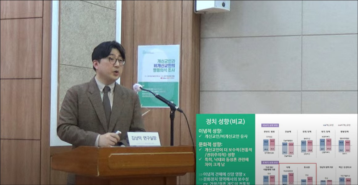 이런 설문조사 결과에 대해 김상덕 연구실장은 "개신교인이 비개신교인과는 달리 문화적 측면에서 전통적 가치관과 권위주의적인 성향을 갖고 있는 것으로 나타났다"라며 "문화적 보수성은 연령이 높을수록 더 권위주의적인 것으로 나타났으며, 남성이 여성보다 더 권위적인 성향을 보인다. 이 결과는 개신교인을 이념적으로 진보와 보수로 구분하는 것 이외에 연령 및 성별 차이가 존재하며, 사안별로는 문화적 보수-진보 사이의 갈등과 차이가 존재하는 것을 알 수 있다"라고 분석했다.