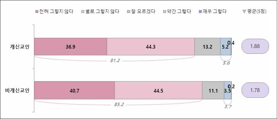 무엇보다 비개신교인 4명 중 1명(25.5%)은 개신교 교회가 차별과 혐오를 ‘매우 부추긴다’라고 답해, 개신교에 대한 비개신교인의 부정적 인식이 매우 심각함을 보여줬다. 이는 공산주의, 동성애, 이슬람 반대의 목소리를 내온 보수적 그리스도교 세력이 개신교를 대표하는 것처럼 여겨져 온 것과 관련이 있어 보인다고 분석된다.