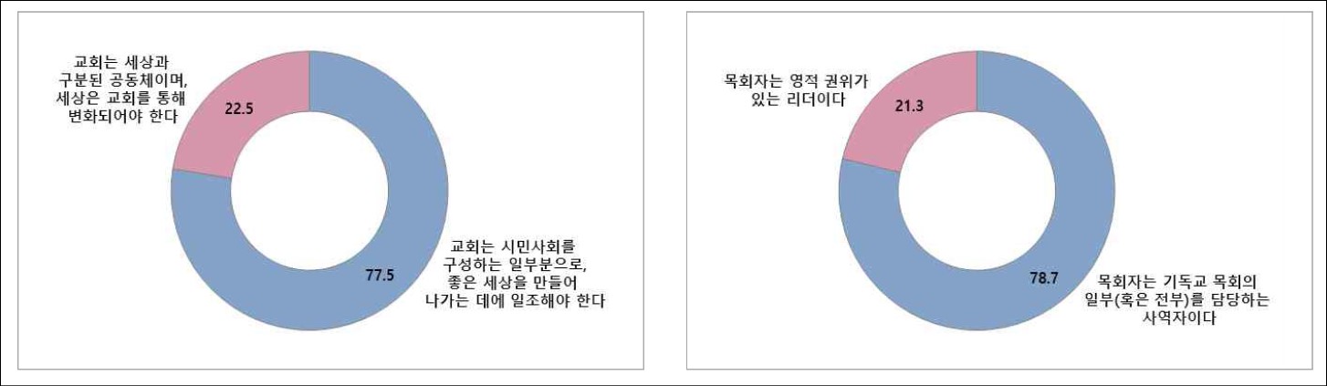 개신교인을 대상으로 교회와 목회자에 대한 의견을 물은 결과, 전체 응답자의 77.5%는 교회를 시민사회를 구성하는 일부로, 22.5%는 교회를 세상과 구분된 공동체로 보았다. 목회자의 역할에 대해서는 기독교 목회를 담당하는 사역자로 보는 견해가 78.7%인 반면, 영적 권위가 있는 리더로 보는 의견은 21.3%에 그쳤다.