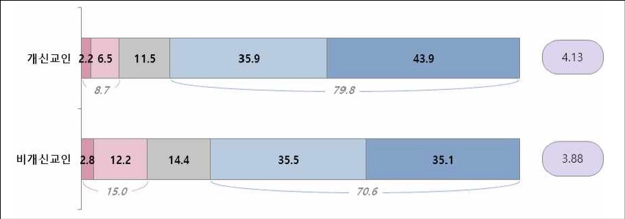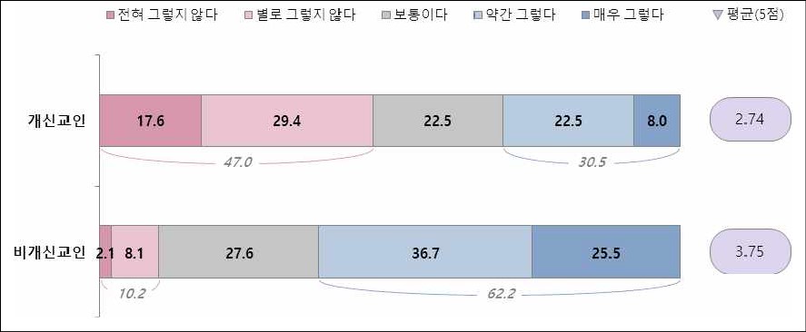무엇보다 비개신교인 4명 중 1명(25.5%)은 개신교 교회가 차별과 혐오를 ‘매우 부추긴다’라고 답해, 개신교에 대한 비개신교인의 부정적 인식이 매우 심각함을 보여줬다. 이는 공산주의, 동성애, 이슬람 반대의 목소리를 내온 보수적 그리스도교 세력이 개신교를 대표하는 것처럼 여겨져 온 것과 관련이 있어 보인다고 분석된다.