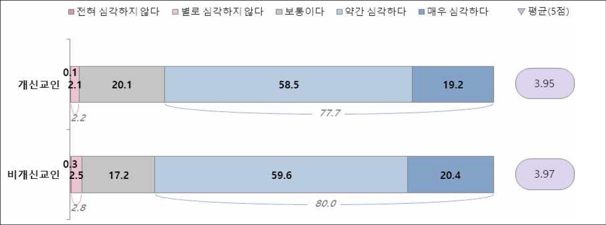 특히 우리 사회에서 특정 집단에 대한 차별과 혐오 문제가 ‘심각하다(약간+매우)’는 의견이 개신교인 77.7%, 비개신교인 80.0%로 모두 높게 나타났다.