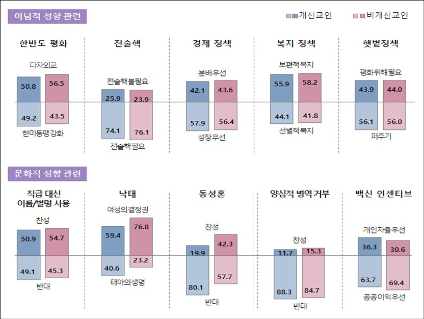 개신교인의 정치 성향이 비개신교인과 큰 차이는 보이지 않았지만, 문화적으로는 조금 더 보수적(권위주의적)으로 나타났다. 또한 정치와 경제 사회분야의 평등과 관련된 인식에서도 비개신교인과 뚜렷한 차이점이 없는 등 신앙이 평등과 같은 사회 인식에 크게 영향을 주지 못하는 것으로 조사됐다.